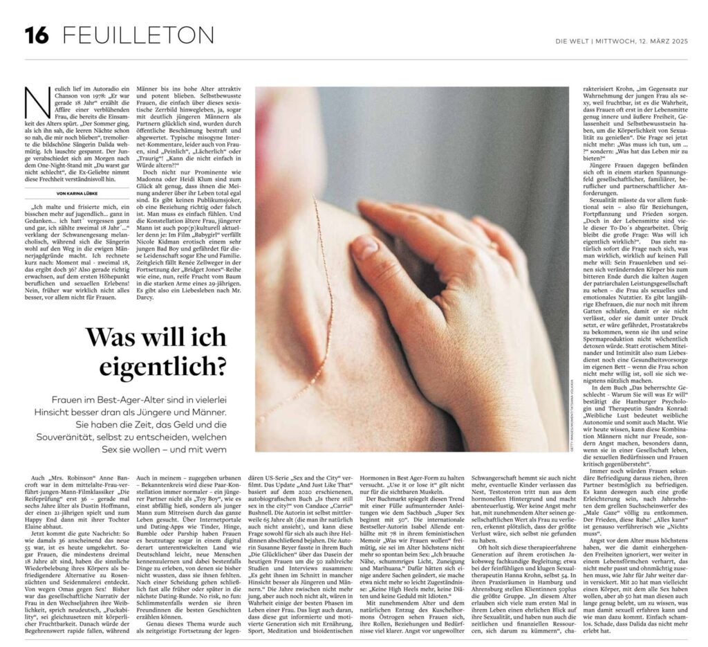Die lebenskluge und scharfzüngige Karina Lübke hat für das Feuilleton der WElT einen Artikel über die „neuen erotischen Optionen der Frau um die 50“ geschrieben und ich feiere das – nicht nur, weil sie darin mich und meine Arbeit zitiert.